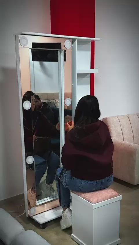 Este tocador Hollywood está hecho de madera MDF 100% compactada y pintado en un brillante blanco macizo. Con unas medidas de 170 cm de alto, 55 cm de ancho y 80 cm de largo, es el lugar perfecto para maquillarte cómodo. Tiene 4 cajones para guardar tus cosas y 8 bombillos LED que iluminan justo como necesitas. Incluye también una práctica butaca baúl. ¡Prepárate para lucir espectacular con garantía de 12 meses!